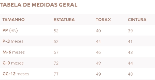 📍 Na Melinda Atelier, seguimos os padrões de medidas da ABNT, mas sabemos que cada bebê tem seu próprio ritmo de crescimento! Como pequenos da mesma idade podem ter tamanhos bem diferentes, recomendamos comparar as medidas do seu bebê com a tabela abaixo. Assim, você escolhe o tamanho ideal sem erro.